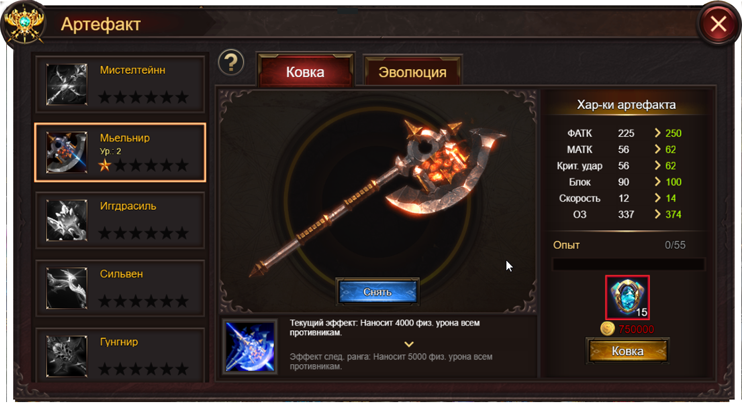 Эволюция - усиливает эффект наносимого урона и дает % прибавку к характеристикам артефакта. Для нее вам потребуются осколки артефактов и особый предмет -“Камень души”.