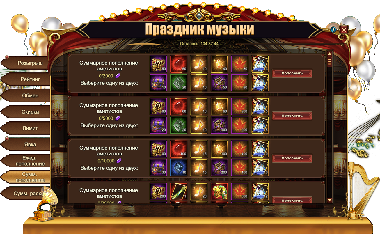 За пополнение счета на определенное количество аметистов за один день, вы можете получить: Изумруд, Сундук кристаллов 5 ур., Сундук камней элементаля 4 ур., Нота, Саксофон, Душа крыльев святости, Песок темной звезды, Сундук кристаллов 7 ур., Сундук снаряжения питомца (оранж.), Сундук снаряжения героя (оранж.), Сундук книг навыков, Турмалин, Фрагмент сибы-ину, Сущность артефакта, Сундук редкостей, Сундук самоцветов 8 ур., [Фрагмент карты] Тюр.