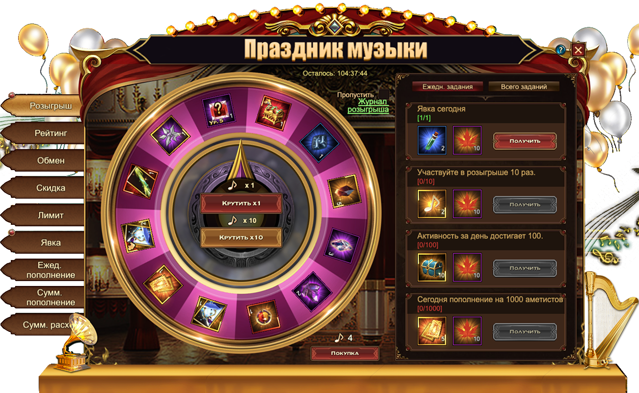 За пополнение счета на определенное количество аметистов за один день, вы можете получить: Изумруд, Сундук кристаллов 5 ур., Сундук камней элементаля 4 ур., Нота, Саксофон, Душа крыльев святости, Песок темной звезды, Сундук кристаллов 7 ур., Сундук снаряжения питомца (оранж.), Сундук снаряжения героя (оранж.), Сундук книг навыков, Турмалин, Фрагмент сибы-ину, Сущность артефакта, Сундук редкостей, Сундук самоцветов 8 ур., [Фрагмент карты] Тюр.
