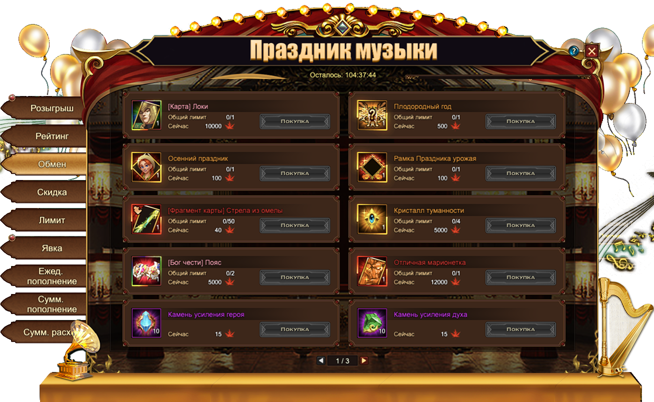 Здесь любопытные искатели приключений могут отыскать временные предложения, доступные в течение ограниченного времени и в ограниченном количестве. Группы товаров доступы с 8:00 до 11:59, с 12:00 до 17:59, с 18:00 до 20:59 и с 21:00 до 7:59. В этот раз вы можете получить в том числе: Янтарь, Эссенция талисмана, Саксофон, Ноты, Обучающее устройство, [Фрагмент Карты] Хеймдалль.