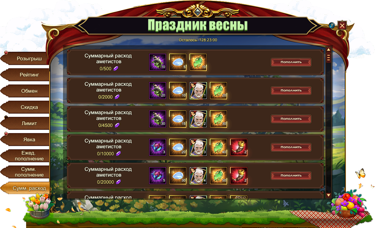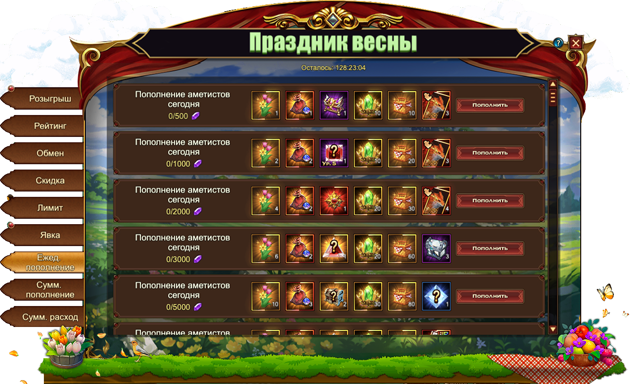 За пополнение счета на определенное количество аметистов за один день, вы можете получить: [Редк.] Стигмат, Сундук самоцветов 6 ур., Сундук камней элементаля 4 ур., Сундук кристаллов 5 ур., Букет, Корзинка, Камень повышения духа, Сундук карт SSR, Сундук кристаллов 7 ур., Сундук книг навыков, Сундук кристаллов 9 ур., Сундук с эссенцией стигмата, Сущность артефактаСундук редкостей, Фрагмент лисицы, Письмо с молитвой, Сундук карт UR, Сундук самоцветов 9 ур.[Фрагмент карты] Тюр.