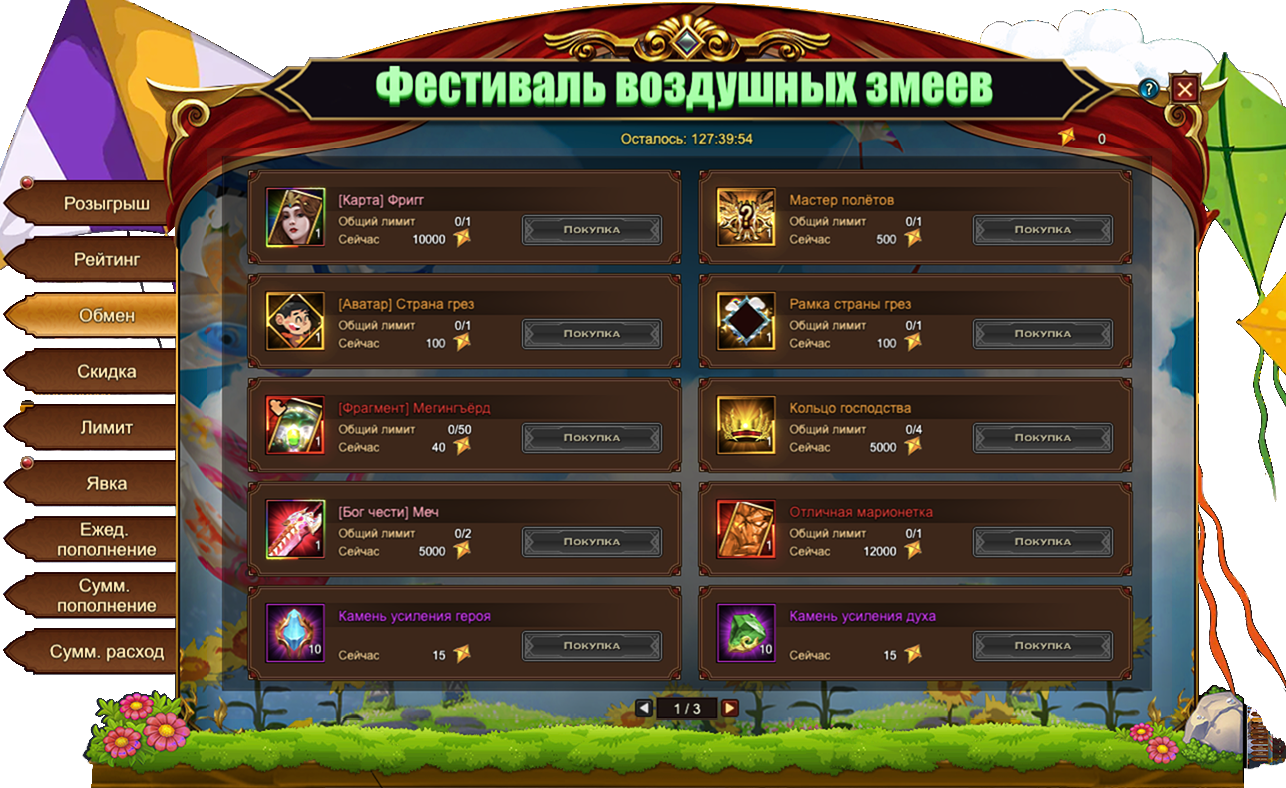 Золотые воздушные змеи, собранные во время данного Фестиваля, позволяют приобрести множество интересных предметов, в том числе и эксклюзивных для данного события: [Карта] Хеймдалль, титул Мастер полетов[Аватар] Страна грезРамка страны грез[Фрагмент карты] Стрела из омелы. Если эксклюзивные предметы вас не интересуют, всегда можно обменять Золотые воздушные змеи на полезные ресурсы. Например, на Кольцо господстваОтличная марионетка или [Бог чести] Меч