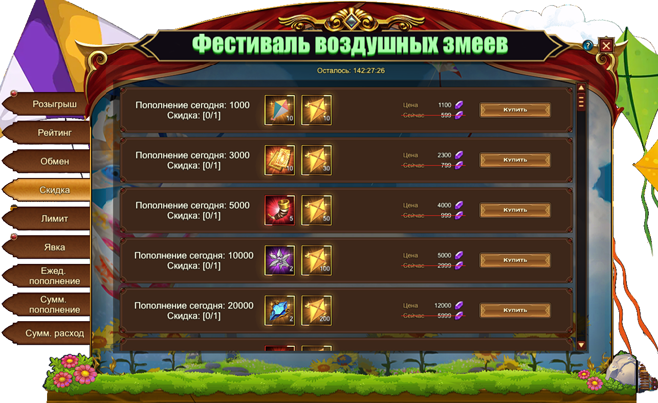 Обратите внимание, для активации скидки необходимо выполнить условие из первого столбца. Например, на скриншоте ниже, для приобретения со скидкой набора из 10 Воздушных змеев и 10 Золотых воздушных змеев необходимо пополнить счет на 1000.