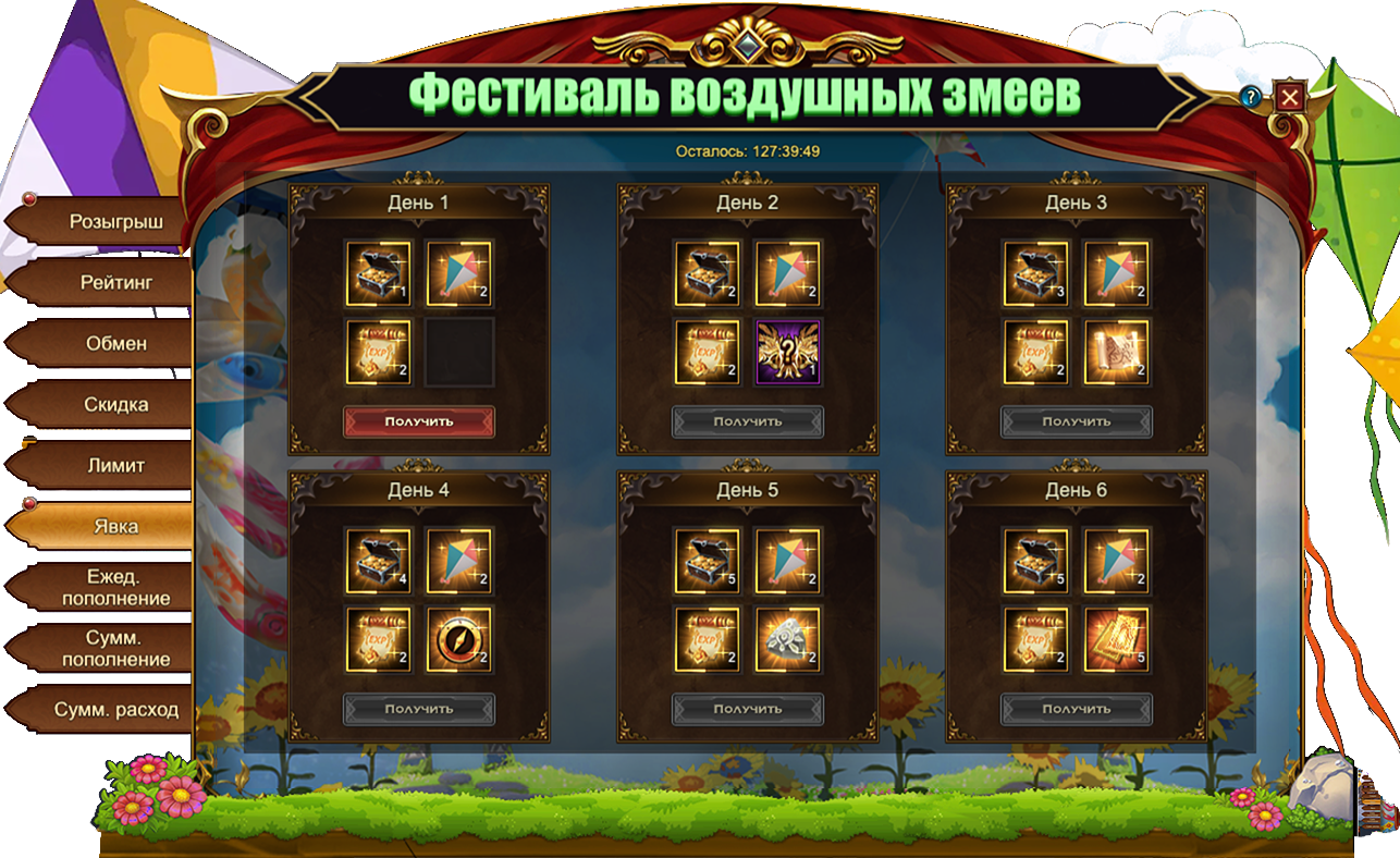 За посещение события ежедневно становятся доступны различные подарки. Например: Воздушный змейСумка золотаОранжевый свиток опыта, уникальный титул В небо!Потерянная картаПропуск на Арену и Свиток славы.
