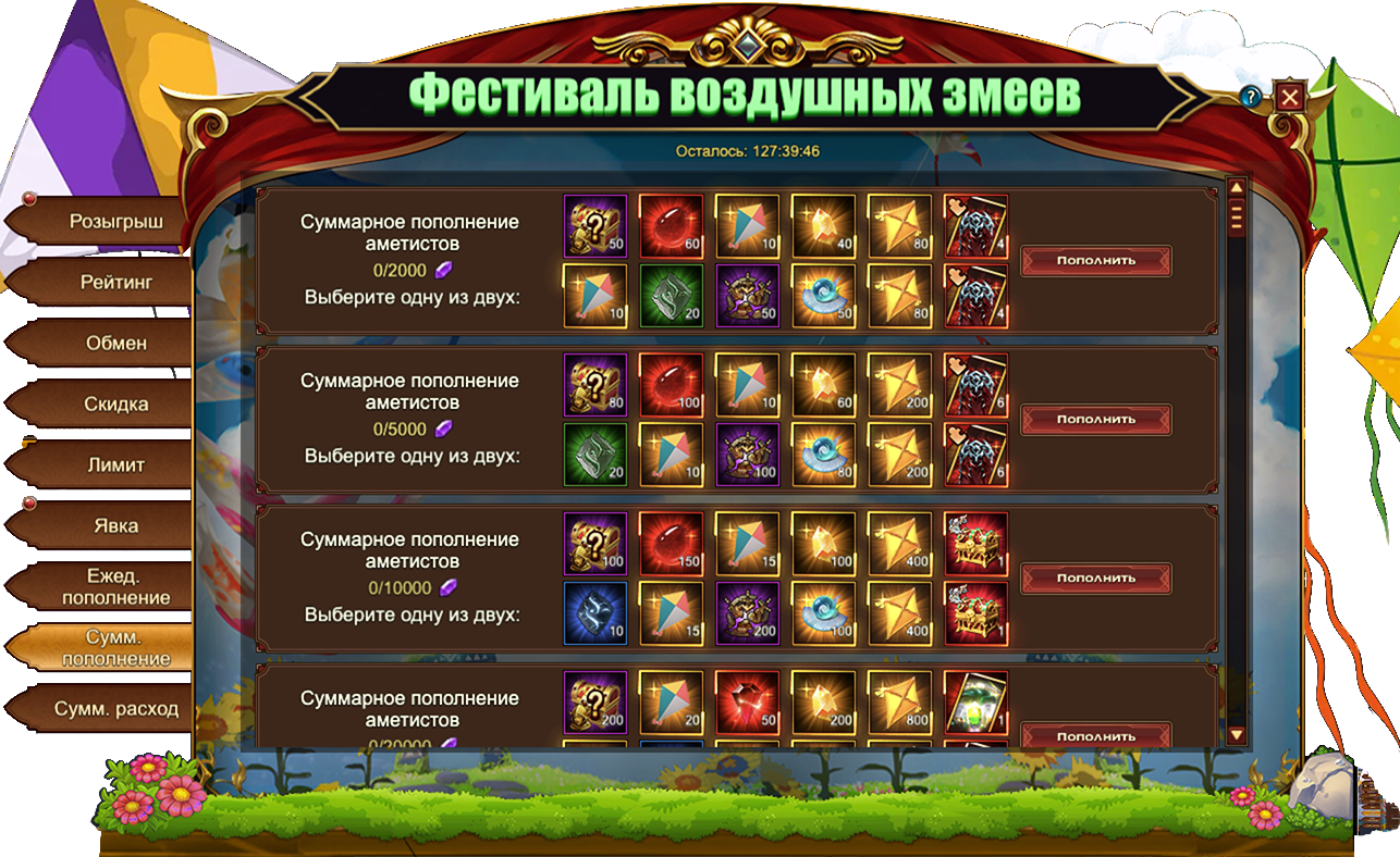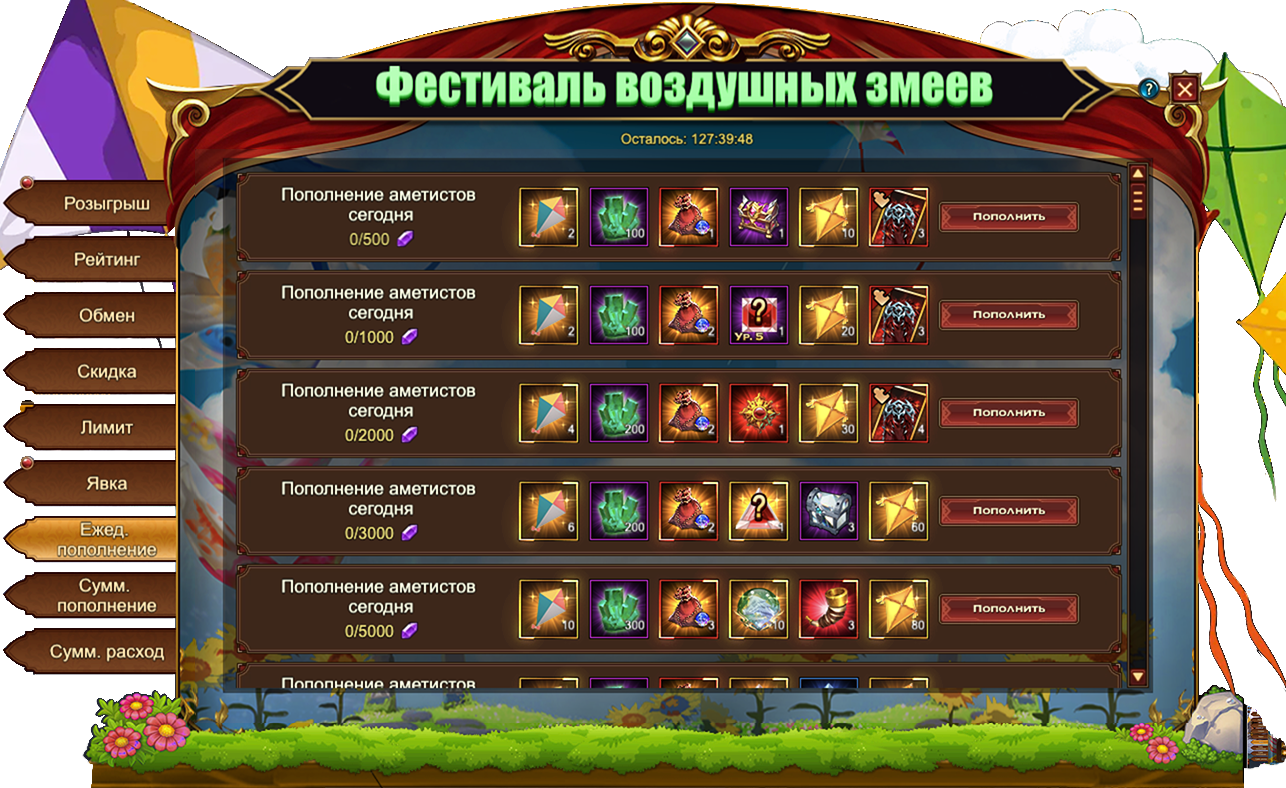 За пополнение счета на определенное количество аметистов за один день, вы можете получить: [Редк.] Стигмат, Сундук кристаллов 5 ур.Сундук камней элементаля 4 ур., Сундук самоцветов 6 ур.Изумруд, Воздушный змейЗолотой воздушный змейДух крыльев святости, Сундук кристаллов 9 ур.Сундук кристаллов 7 ур., Сундук с эссенцией стигмата, Сущность артефактаФрагмент крыльев плащевидных, Письмо с молитвой, Простой горнСундук редкостей, Сундук с кодексом, [Фрагмент карты] Тюр.