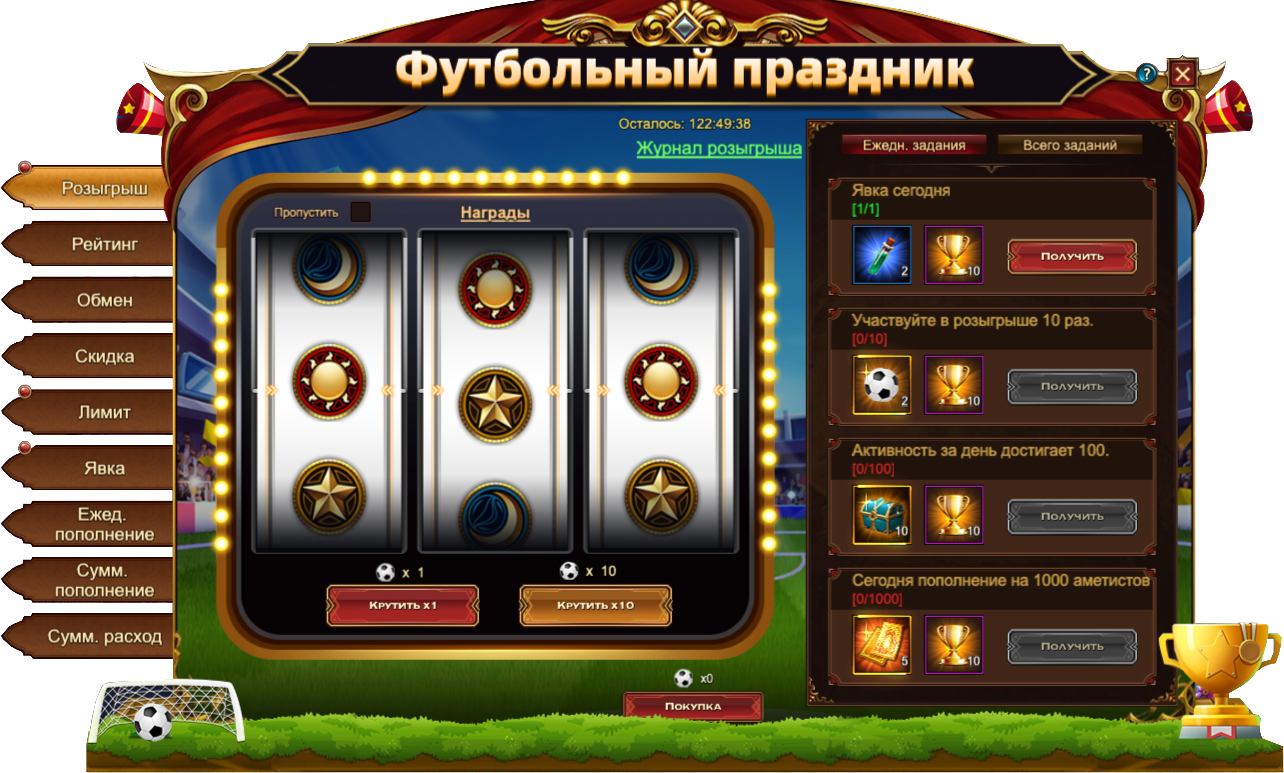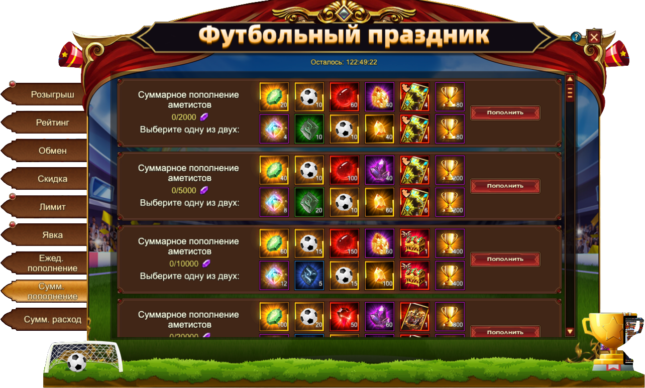 За пополнение счета на определенное количество аметистов за один день, вы можете получить: [Редк.] Стигмат, [Героич.] СтигматСундук кристаллов 5 ур.Сундук камней элементаля 4 ур., Сундук самоцветов 6 ур., Футбольный мячТрофейЭссенция талисмана, Сундук кристаллов 7 ур.Сундук кристаллов 9 ур., Сундук с эссенцией стигматаСундук книг навыков, Сущность артефактаСундук редкостей, Сундук карт UR, Письмо с молитвой, [Фрагмент карты] Тюр.