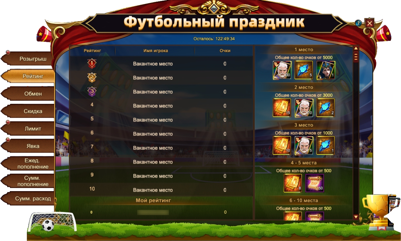 Трофеи, собранные во время данного Фестиваля, позволяют приобрести множество интересных предметов, в том числе и эксклюзивных для данного события: [Карта] Брунгильда, Особый титул Отважно к победе[Аватар] Спортивная головаРамка праздника футбола[Фрагмент карты] Кольцо Драупнир. Если эксклюзивные предметы вас не интересуют, всегда можно обменять Трофеи на полезные ресурсы. Например, на Таинственный каменьОтличная марионетка или [Бог чести] Меч