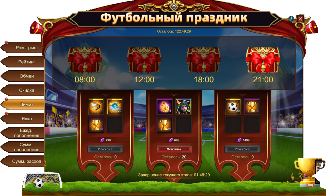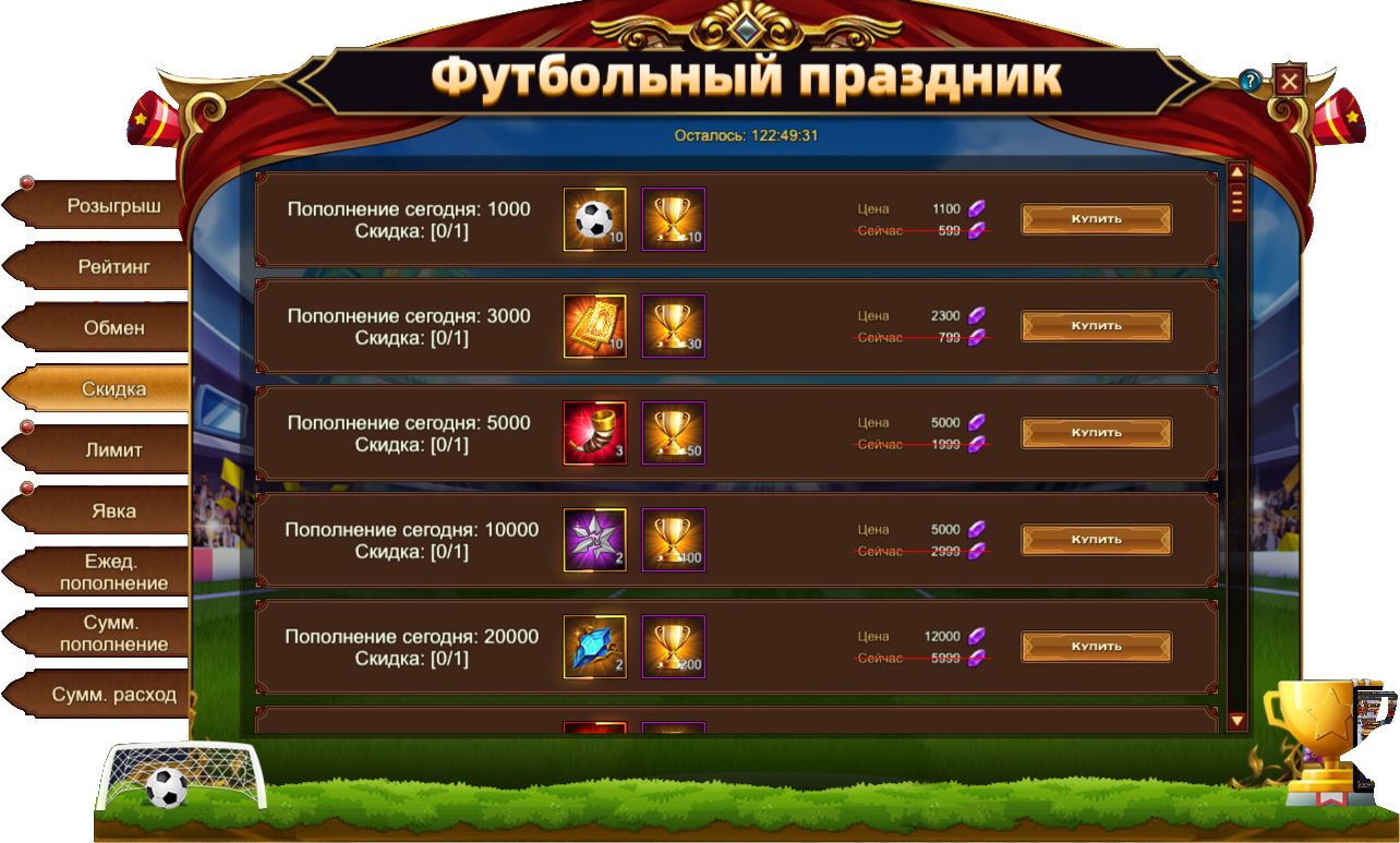 Обратите внимание, для активации скидки необходимо выполнить условие из первого столбца. Например, на скриншоте ниже, для приобретения со скидкой набора из 10 Футбольных мячей и 10 Трофеев необходимо пополнить счет на 1000.