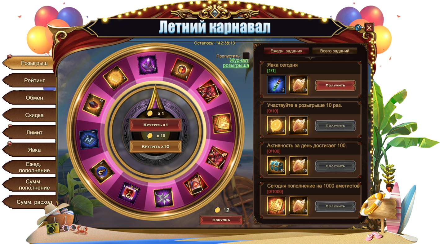 Участвуйте в розыгрыше различных ценных предметов, чтобы получить: Рутил, Чароит, Сундук кристаллов 5 ур., Кристалл чар демона, Кристалл повышения богини, Песок темной звезды, Свиток славы, Оранжевое созвездие, Кристалл души крыльев, Фрагмент цербера, Шкатулка Фригг и даже Цербер целиком!