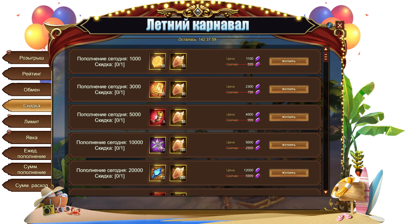 Обратите внимание, для активации скидки необходимо выполнить условие из первого столбца. Например, на скриншоте ниже, для приобретения со скидкой набора из 10 Апельсинов и 10 Морских раковин необходимо пополнить счет на 1000.