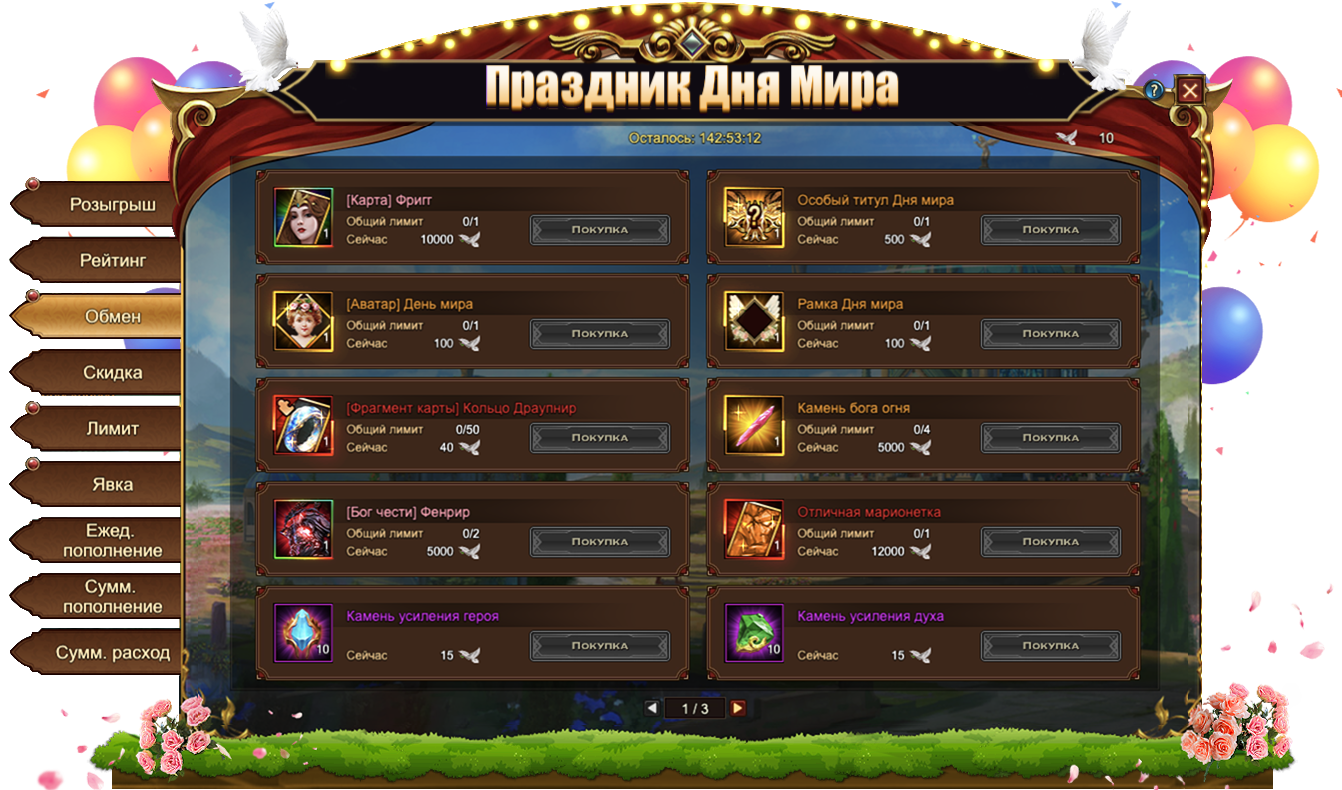 Голуби мира, собранные во время данного Фестиваля, позволяют приобрести множество интересных предметов, в том числе и эксклюзивных для данного события: [Карта] ФриггОсобый титул Дня мира[Аватар] День мираРамка Дня мира[Фрагмент карты] Кольцо Драупнир. Если эксклюзивные предметы вас не интересуют, всегда можно обменять Голубей мира на полезные ресурсы. Например, на Камень бога огняОтличная марионетка или [Бог чести] Фенрир