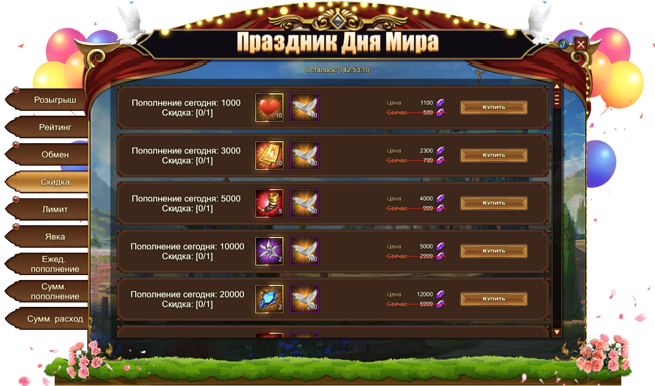 Обратите внимание, для активации скидки необходимо выполнить условие из первого столбца. Например, на скриншоте ниже, для приобретения со скидкой набора из 10 Жетонов дня мира и 10 Голубей мира необходимо пополнить счет на 1000.