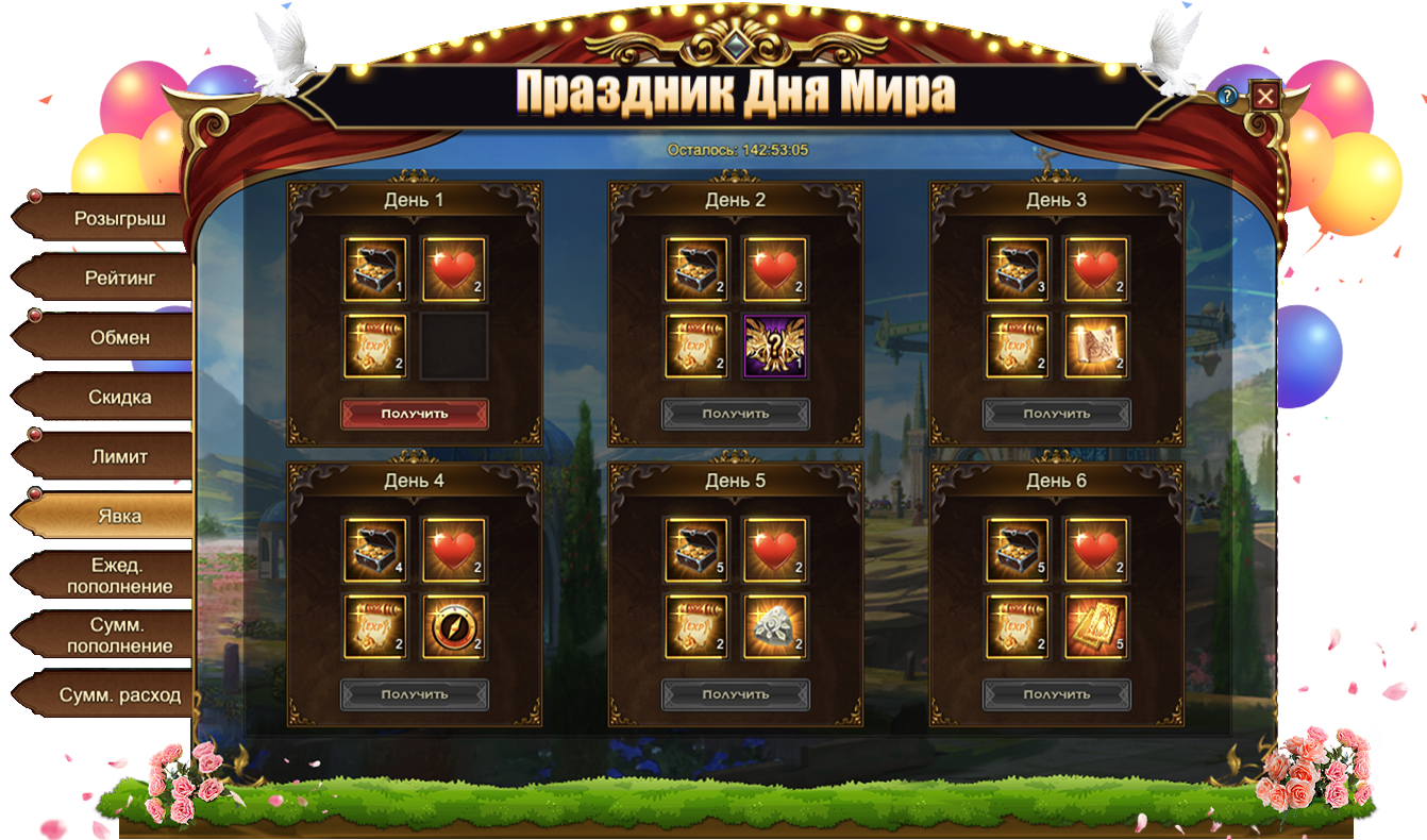 наборов наград со следующими предметами: СеленитРутилКамень улучшения снаряжения, Малое эльфийское зелье, Опал, Голубь мираЖетон дня мира, Рубеллит, Кристалл повышения богини, Среднее эльфийское зелье, Турмалин, Сущность артефакта, Камень мудрости, Кристалл мудрости, Ярдро мудрости, Фрагмент светоцикла, Камень мудрости, Сундук наряда Верховной богини, Кольцо Драупнир, Сундук сокровищ богини, Сундук снаряжения скакуна (красн.), Простой горн, Особый сундук книг навыков, Сундук отличных питомцев, Сундук снаряжения героя (красн.), Сундук оружия питомца, Легенд. Стигмат[Карта] Фригг[Карта] Тюр