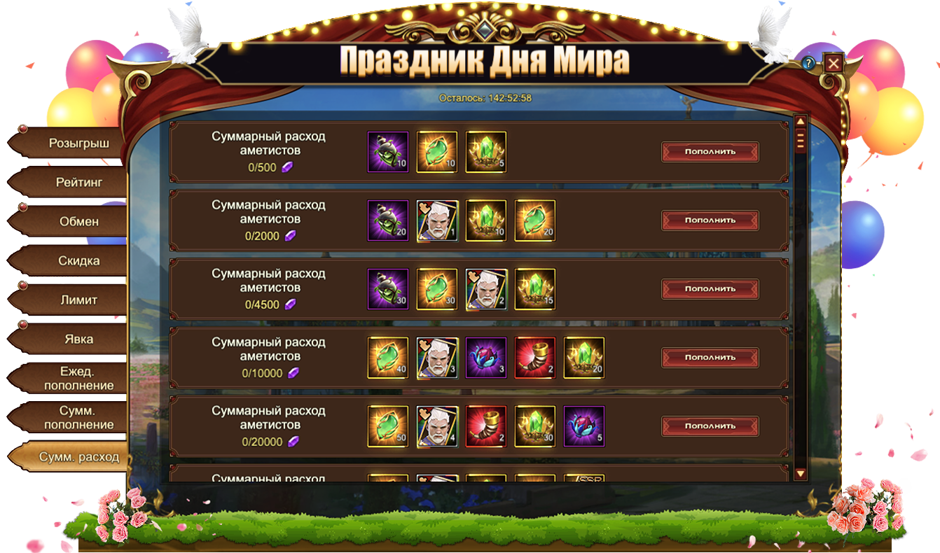 За пополнение счета на определенное количество аметистов за один день, вы можете получить: Сундук кристаллов 5 ур., Сундук самоцветов 6 ур., Сундук камней элементаля 4 ур., Голубь мира, Жетон дня мира, Цитрин, Сундук с эссенцией стигмата, Сундук кристаллов 9 ур., Сущность артефактаСундук редкостей, Письмо с молитвой, Простой горн, Сундук самоцветов 8 ур., Сундук снаряжения героя (красн.), Фрагмент светоцикла,[Фрагмент карты] Тюр.