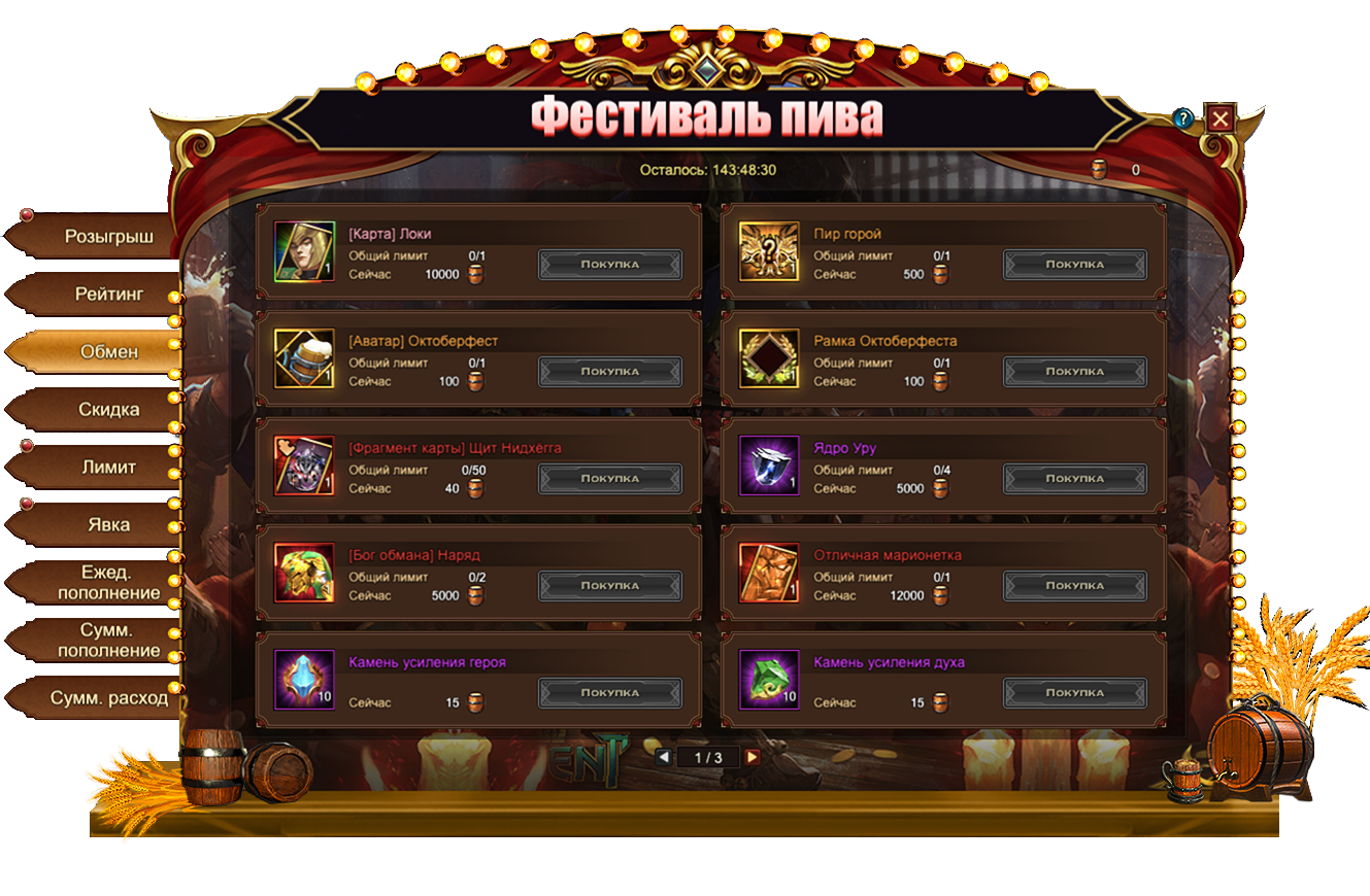 Бочонки пива, собранные во время данного Фестиваля, позволяют приобрести множество интересных предметов, в том числе и эксклюзивных для данного события: [Карта] Локи, Особый титул Пир горой[Аватар] ОктоберфестРамка Октоберфеста, [Фрагмент карты] Щит Нидхегга. Если эксклюзивные предметы вас не интересуют, всегда можно обменять Бочонки пива на полезные ресурсы. Например, на Ядро Уру, Отличная марионетка или [Бог обмана] Наряд