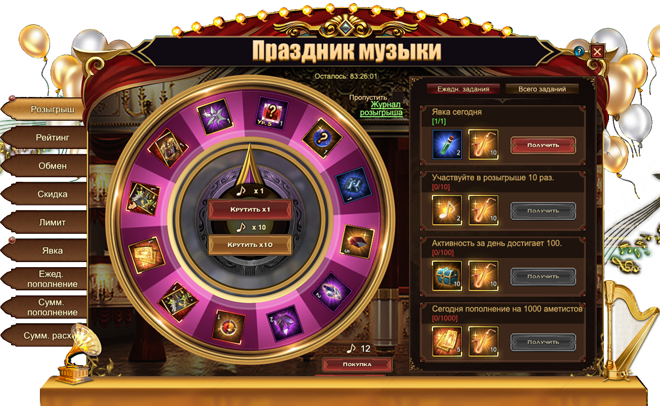 Участвуйте в розыгрыше различных ценных предметов, чтобы получить: Рутил, Чароит, Мрачные одежды, Сундук кристаллов 5 ур., Свиток славы, Оранжевое созвездие, Песок темной звезды, Кристалл чар демона, Кристалл души крыльев, Эмблема величия, Фрагмент гоблина и даже Гоблина целиком!
