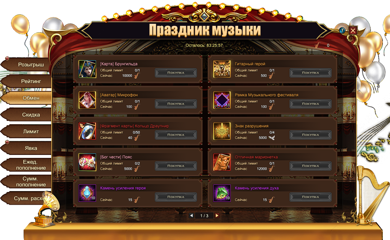 За участие в Розыгрыше вы получаете специальные очки, определяющие ваше положение в Рейтинге фестиваля. В зависимости от положения в рейтинге можно получить: Свитки славыСущность артефакта[Фрагмент карты] ТюрФиолетовые свитки опыта и даже героя класса UR - несравненную Брунгильду
