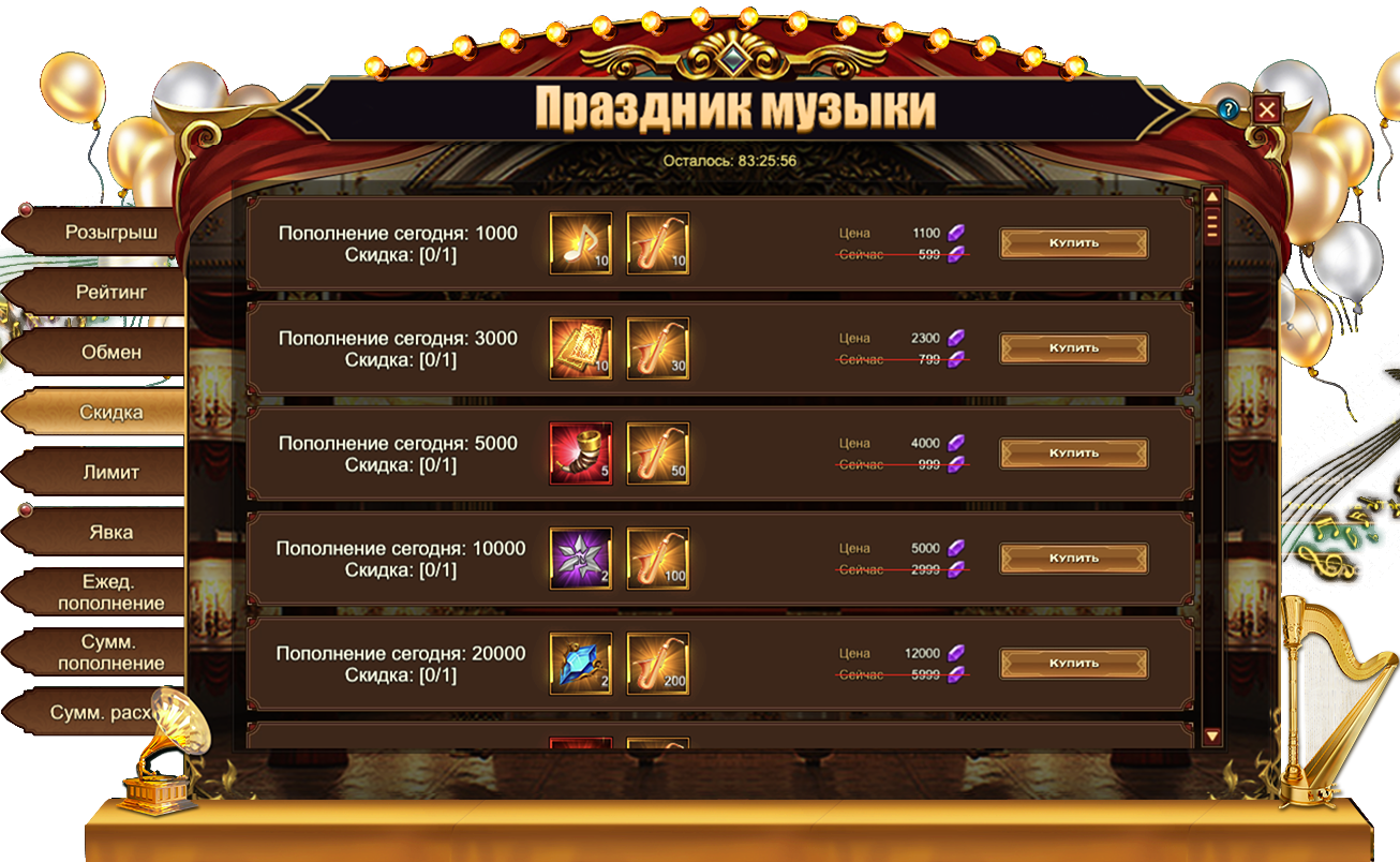 Обратите внимание, для активации скидки необходимо выполнить условие из первого столбца. Например, на скриншоте ниже, для приобретения со скидкой набора из 10 Нот и 10 Саксофонов необходимо пополнить счет на 1000.