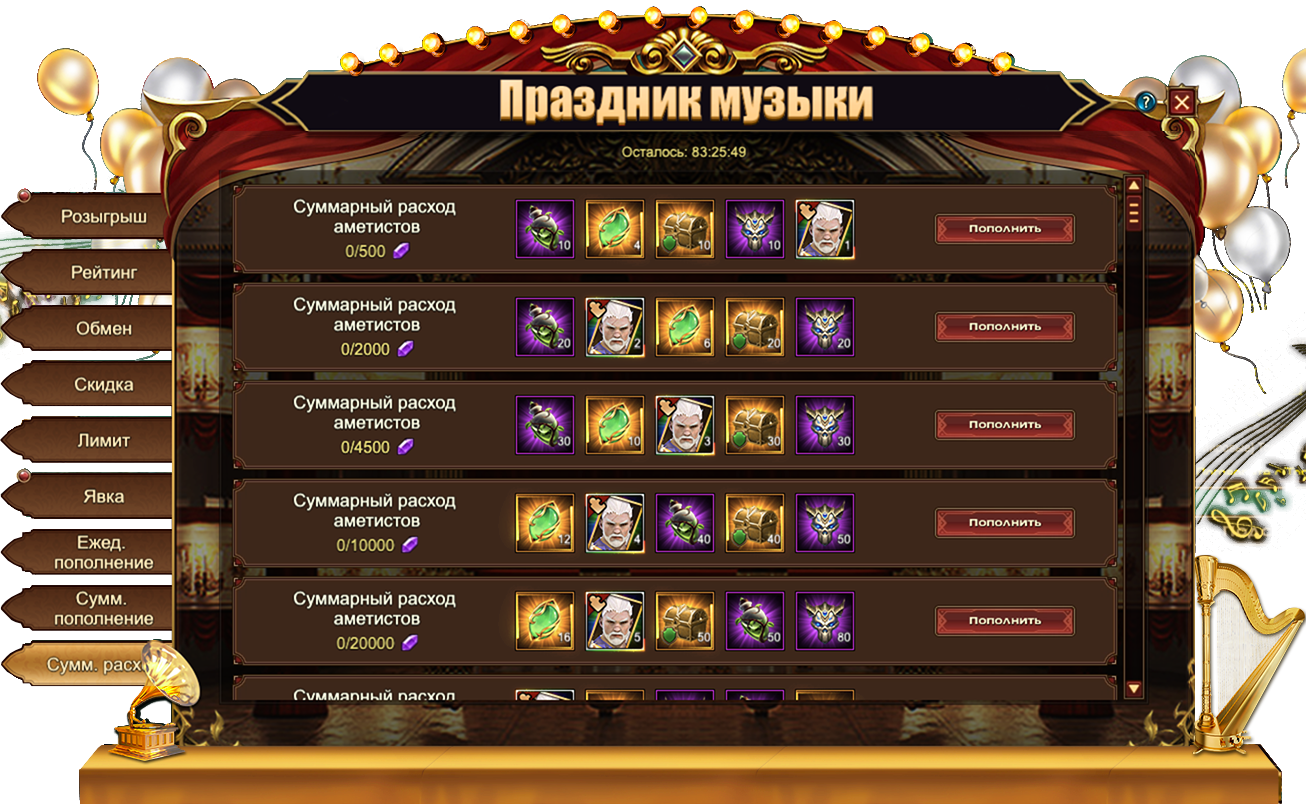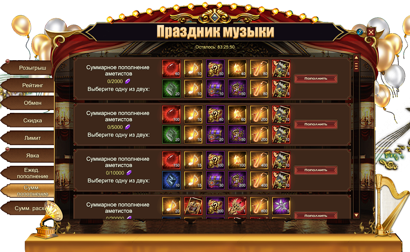 За пополнение счета на определенное количество аметистов за один день, вы можете получить: Изумруд[Героич.] СтигматСундук кристаллов 5 ур.Сундук камней элементаля 4 ур., НотаСаксофонДух крыльев святости, Сундук кристаллов 7 ур., Сундук снаряжения питомца (оранж.), Сундук снаряжения героя (оранж.), Сущность артефактаСундук редкостейСундук самоцветов 8 ур., Письмо с молитвой, Фрагмент гоблина.