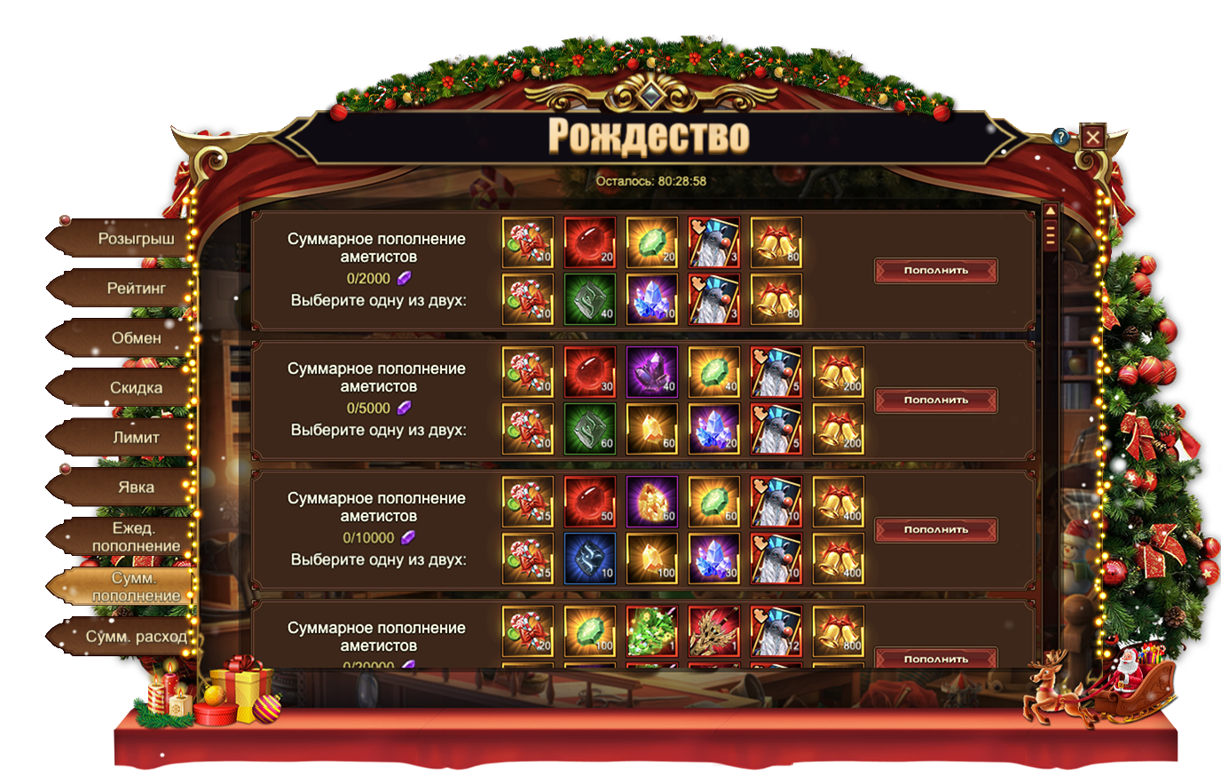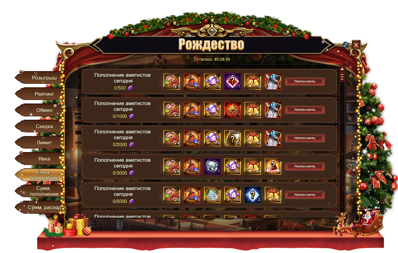 За пополнение счета на определенное количество аметистов за один день, вы можете получить: [Редк.] Стигмат, Сундук кристаллов 6 ур., Сундук самоцветов 6 ур., КолокольчикиКонфеты, Камень повышения героя, Сундук карт SSR, Дух крыльев святостиОранжевое созвездиеСундук кристаллов 7 ур.Песок темной звезды, Сущность артефактаСундук редкостей, Письмо с молитвой, Сундук с кодексомФрагмент Рождественских саней[Фрагмент карты] Тюр.