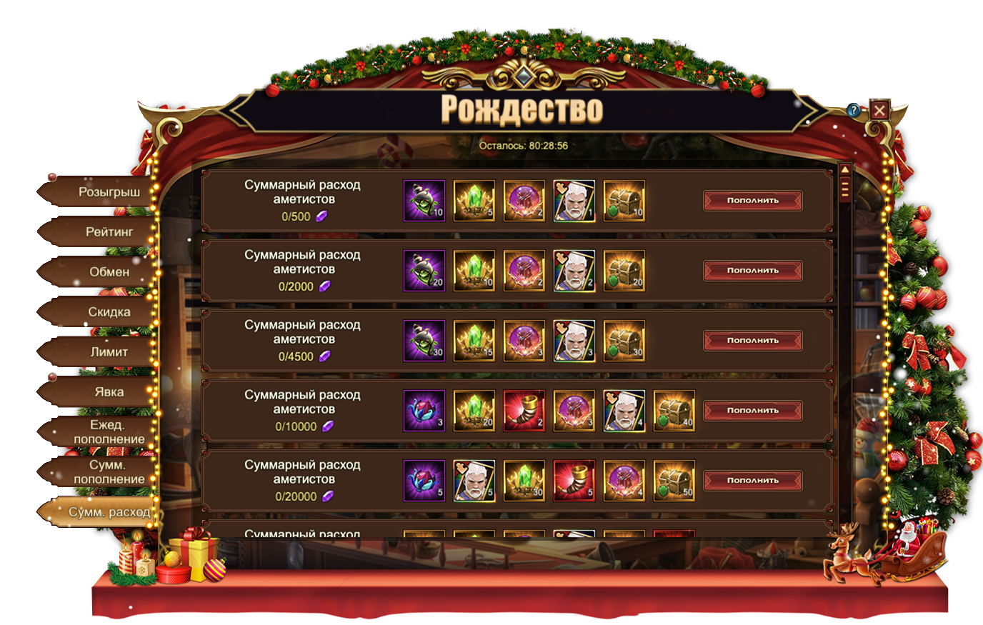 Участвуйте в розыгрыше различных ценных предметов, чтобы получить: ЧароитСундук самоцветов 6 ур., Сундук кристаллов 5 ур.Свиток славы, Кристалл повышения богини, Кольцо господства, Сундук героя 2, Крылья степиФрагмент Рождественских саней и даже восхитительные Рождественские сани целиком!