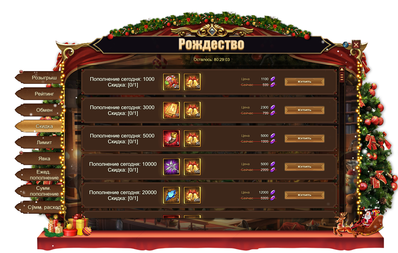Обратите внимание, для активации скидки необходимо выполнить условие из первого столбца. Например, на скриншоте ниже, для приобретения со скидкой набора из Легендарного Эльфа и 10 Колокольчиков необходимо пополнить счет на 1000.