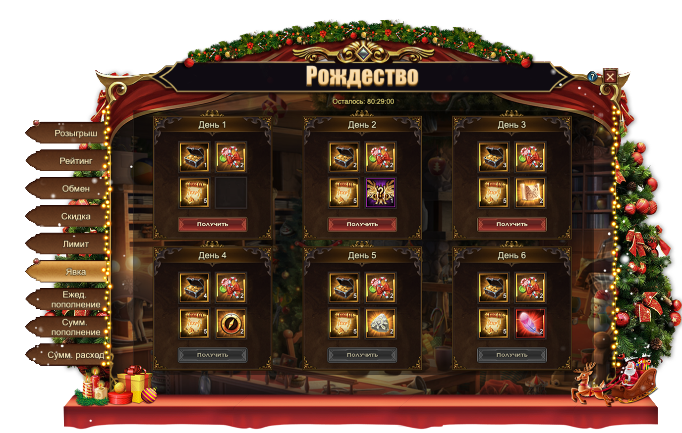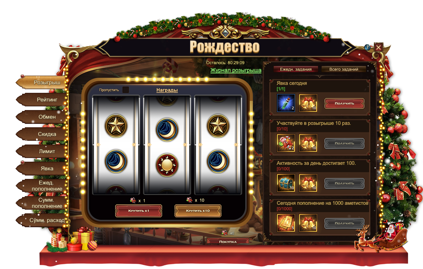 Участвуйте в розыгрыше различных ценных предметов, чтобы получить: ЧароитСундук самоцветов 6 ур., Сундук кристаллов 5 ур.Свиток славы, Кристалл повышения богини, Кольцо господства, Сундук героя 2, Крылья степиФрагмент Рождественских саней и даже восхитительные Рождественские сани целиком!