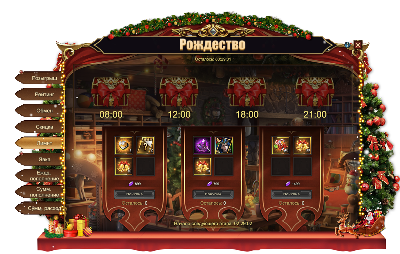 Здесь любопытные искатели приключений могут отыскать временные предложения, доступные в течение ограниченного времени и в ограниченном количестве. Группы товаров доступы с 8:00 до 11:59, с 12:00 до 17:59, с 18:00 до 20:59 и с 21:00 до 7:59. В этот раз вы можете получить в том числе: Чароит, КолокольчикиРождественские конфетыОбучающее устройство, Сундук карт SSR[Фрагмент Карты] Брунгильда.