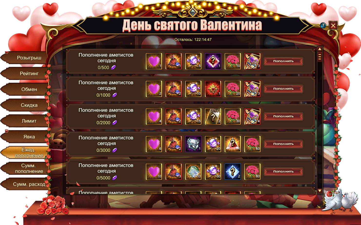 За пополнение счета на определенное количество аметистов за один день, вы можете получить: [Редк.] Стигмат, Сундук кристаллов 6 ур., Сундук самоцветов 6 ур., Лунный камень души, СердечкиБукет Роз, Камень повышения героя, Сундук карт SSR, Песок темной звезды, Сундук кристаллов 7 ур., Дух крыльев святости, Оранжевое созвездие, Сущность артефакта, Сундук редкостей, Письмо с молитвой, Сундук с кодексом, [Фрагмент Карты] Тюр!