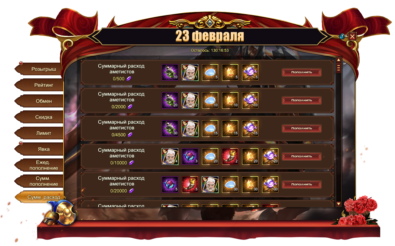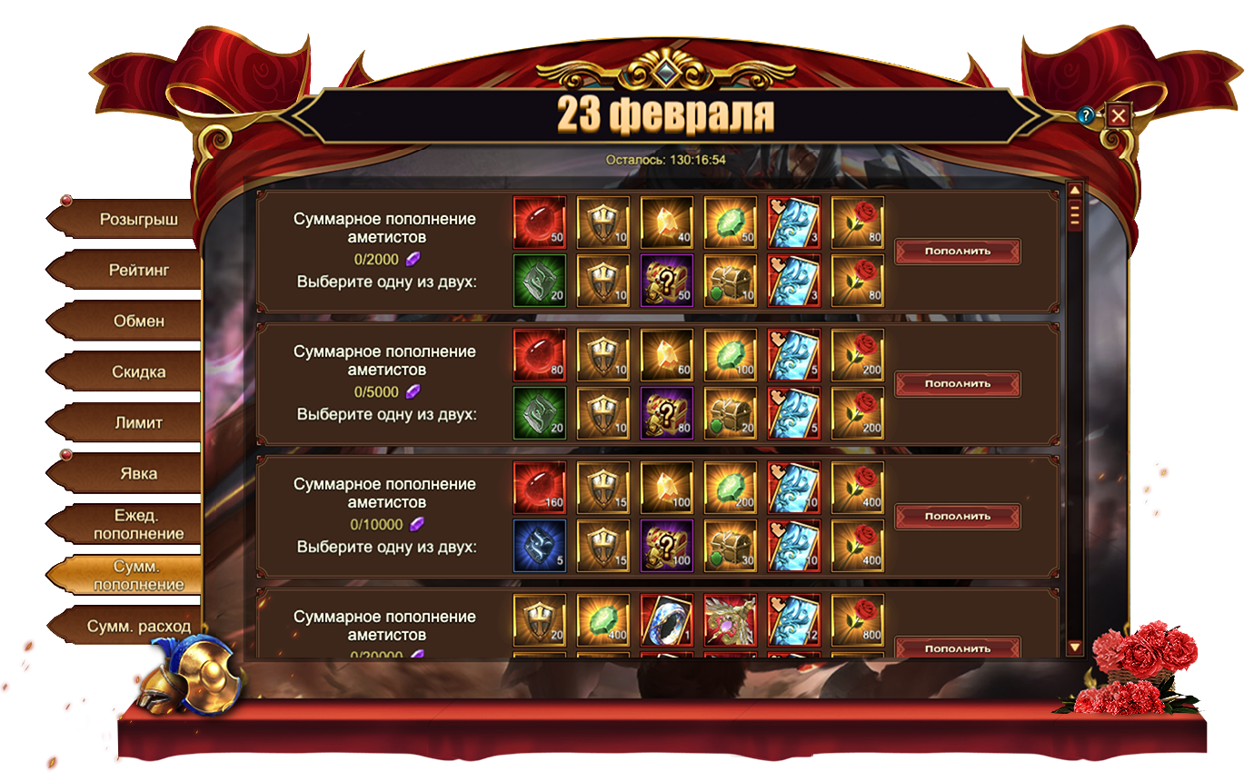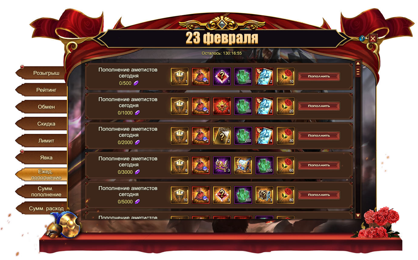 За пополнение счета на определенное количество аметистов за один день, вы можете получить: Изумруд, Сундук кристаллов 6 ур., Сундук камней элементалей 4 ур., Орден, Букет, Сундук карт SSR, Сундук кристаллов 7 ур., Сундук самоцветов 7 ур., Сундук книг навыковм Сундук кристаллов 9 ур., Сущность артефактаСундук редкостейм Письмо с молитвой, Фрагмент голубого пера, Сундук с кодексом, Красное созвездие, Сундук снаряжения героя (красн.), Вечный камень души[Фрагмент карты] Тюр