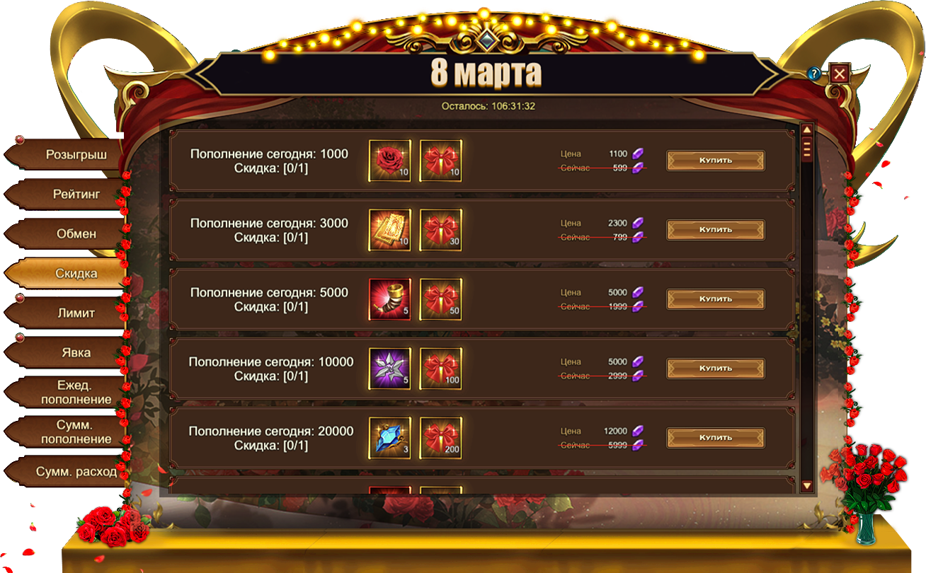 Обратите внимание, для активации скидки необходимо выполнить условие из первого столбца. Например, на скриншоте ниже, для приобретения со скидкой набора из 10 Цветков богини и 10 Бантов необходимо пополнить счет на 1000.