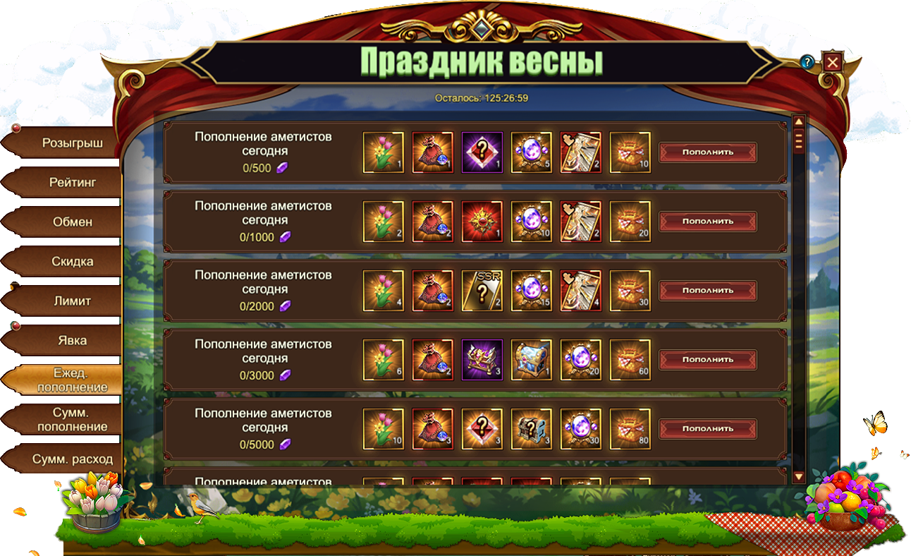 За пополнение счета на определенное количество аметистов за один день, вы можете получить: Букет, Сундук редкостей, Сундук кристаллов 6 ур., Камень повышения героя, Фрагмент небесно-серых крыльев, Корзинка, Письмо с молитвой, Сундук карт SSR, Сундук камней элементаля 4 ур., Сундук самоцветов 7 ур., Сундук кристаллов 9 ур., Сундук книг навыков, Сундук с кодексом, Красное созвездие, Сундук снаряжения героя (красн.), Вечный камень души, [Фрагмент карты] Тюр, Сущность артефакта.
