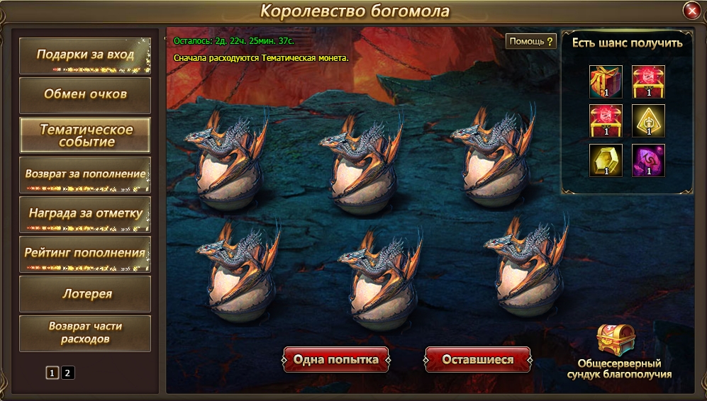5.    С 27 февраля по 8 марта пройдет событие Королевство богомола: всех игроков ждут множество подарков и ярких впечатлений. В период ивента будут работать дополнительные яркие события: Бесконечность подарков, Дом из сладостей и рулетка за нахождение онлайн, в которой можно будет получить монеты уникальных маунтов!