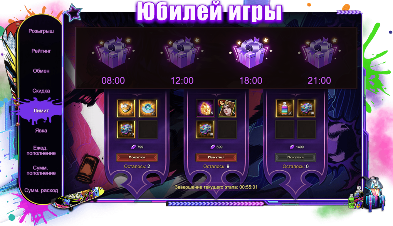 Обратите внимание, для активации скидки необходимо выполнить условие из первого столбца. Например, на скриншоте ниже для приобретения со скидкой набора из 10 Баллончиков с краской и 10 VR шлемов необходимо пополнить счет на 1000.