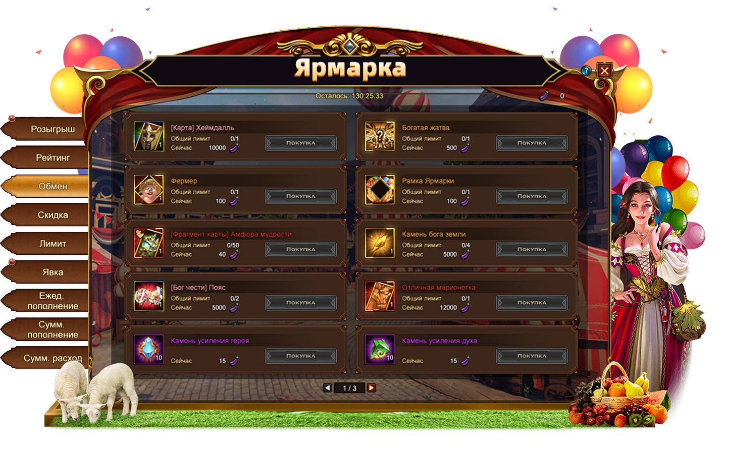 Здесь любопытные искатели приключений могут отыскать временные предложения, доступные в течение ограниченного времени и в ограниченном количестве. Группы товаров доступы с 8:00 до 11:59, с 12:00 до 17:59, с 18:00 до 20:59 и с 21:00 до 7:59. В этот раз вы можете получить в том числе: КукурузаБаклажанОбучающее устройствоЭссенция талисманаЯнтарь[Фрагмент Карты] Хеймдалль.