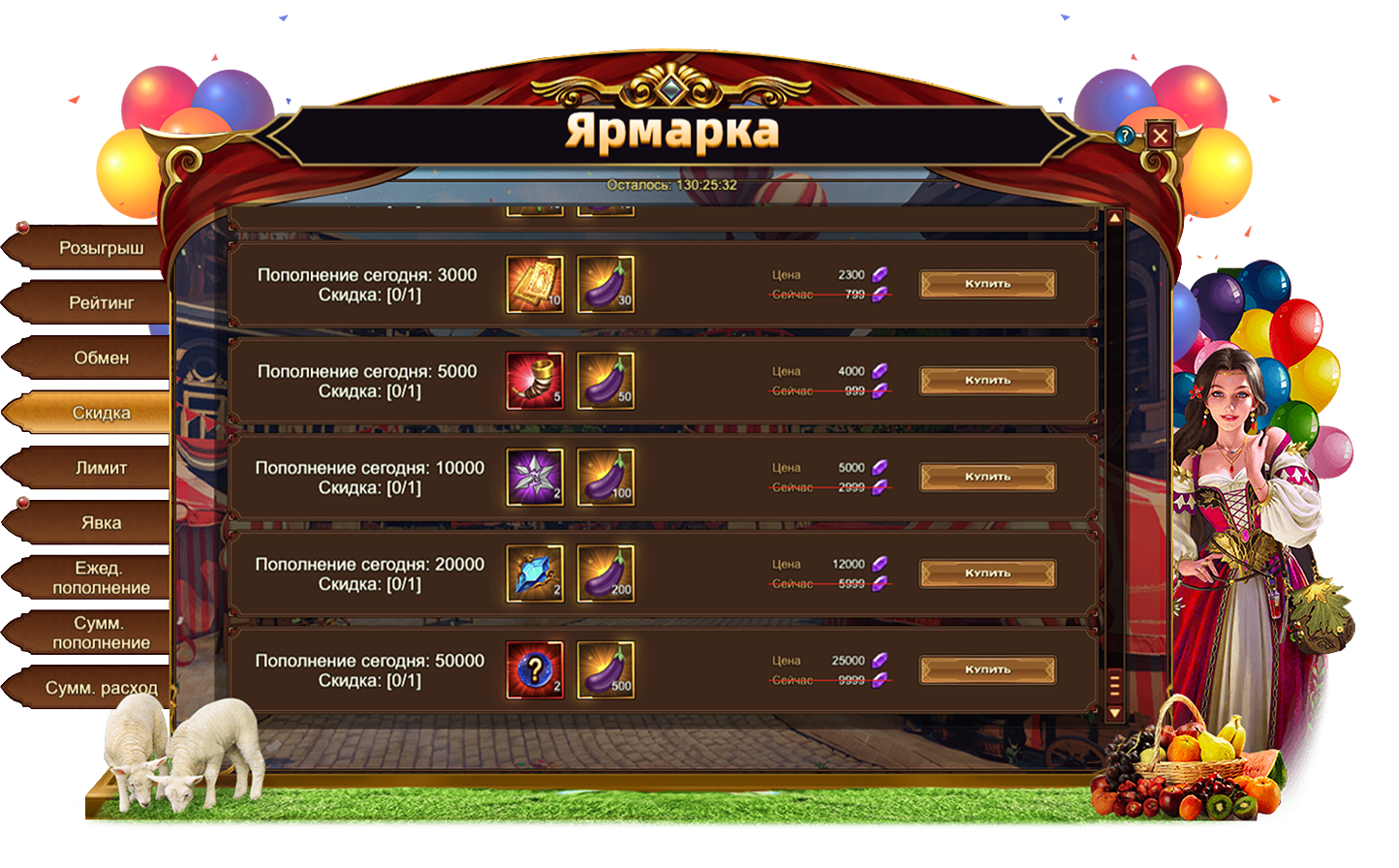 Обратите внимание, для активации скидки необходимо выполнить условие из первого столбца. Например, на скриншоте ниже, для приобретения со скидкой набора из 10 Кукурузы и 10 Баклажанов необходимо пополнить счет на 1000.