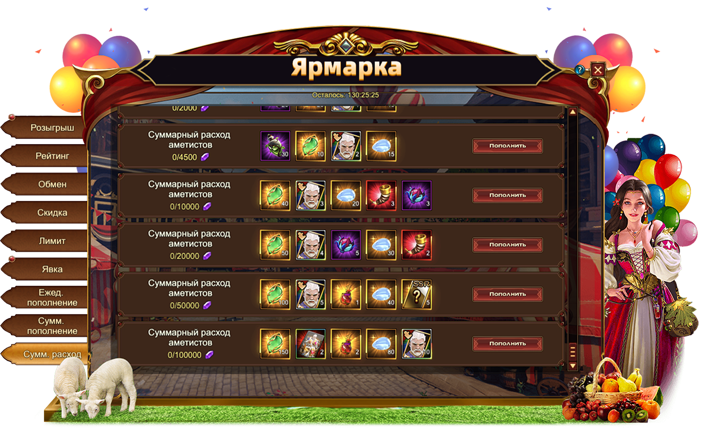 За пополнение счета на определенное количество аметистов за один день, вы можете получить: Изумруд, Сундук кристаллов 5 ур.Сундук камней элементаля 4 ур., Сундук самоцветов 6 ур., КукурузаБаклажан, Сундук кристаллов 9 ур., Сундук с эссенцией стигмата, Сущность артефактаПисьмо с молитвой, Простой горн, Сундук карт UR, Сундук снаряжения героя (красн.), Сундук редкостей, Фрагмент голубого крыла, [Фрагмент карты] Тюр.