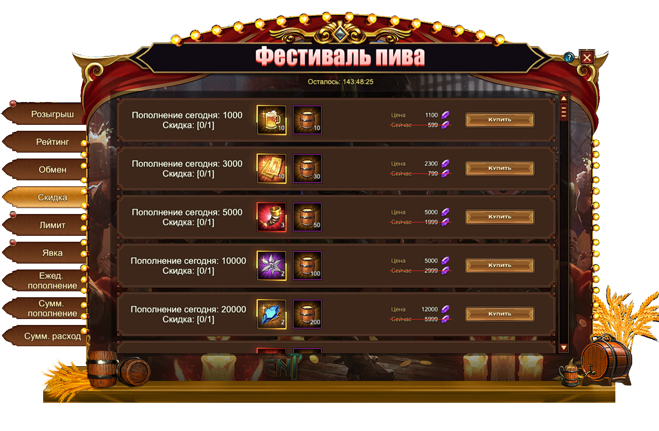 Обратите внимание, для активации скидки необходимо выполнить условие из первого столбца. Например, на скриншоте ниже, для приобретения со скидкой набора из 10 Пива и 10 Бочонков пива мира необходимо пополнить счет на 1000.