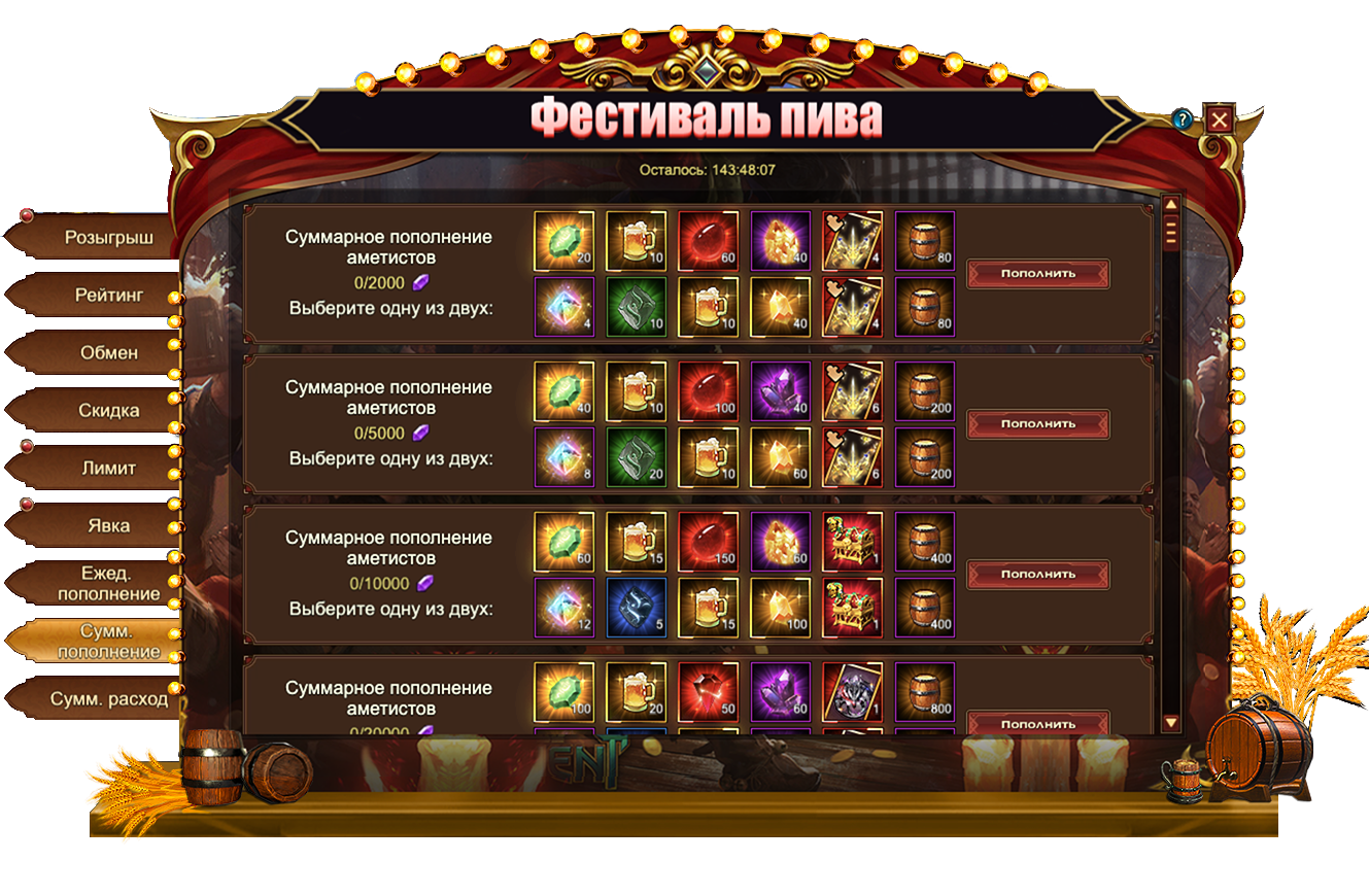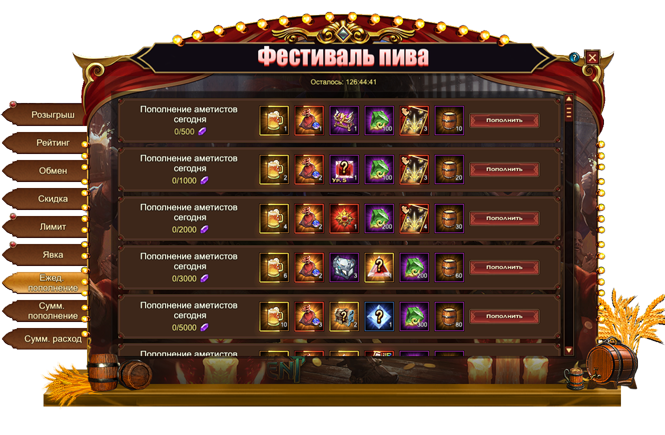 За пополнение счета на определенное количество аметистов за один день, вы можете получить: [Редк.] Стигмат, Сундук самоцветов 6 ур., Сундук кристаллов 5 ур., Сундук камней элементаля 4 ур., Камень усиления духа, [Героич.] Стигмат, Бочонок пива, Пиво, Цитрин, Сундук кристаллов 7 ур, Сундук кристаллов 9 ур., Сундук книг навыков, Сундук с эссенцией стигмата, Сущность артефакта, Сундук редкостей, Фрагмент меча бесконечности, Письмо с молитвой, Сундук карт UR, [Фрагмент карты] Тюр.