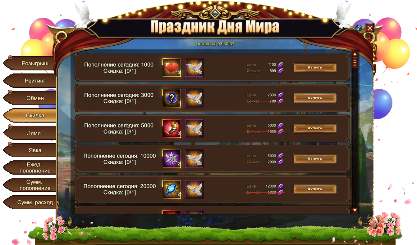 Обратите внимание, для активации скидки необходимо выполнить условие из первого столбца. Например, на скриншоте ниже, для приобретения со скидкой набора из 10 Жетонов дня мира и 10 Голубей мира необходимо пополнить счет на 1000.