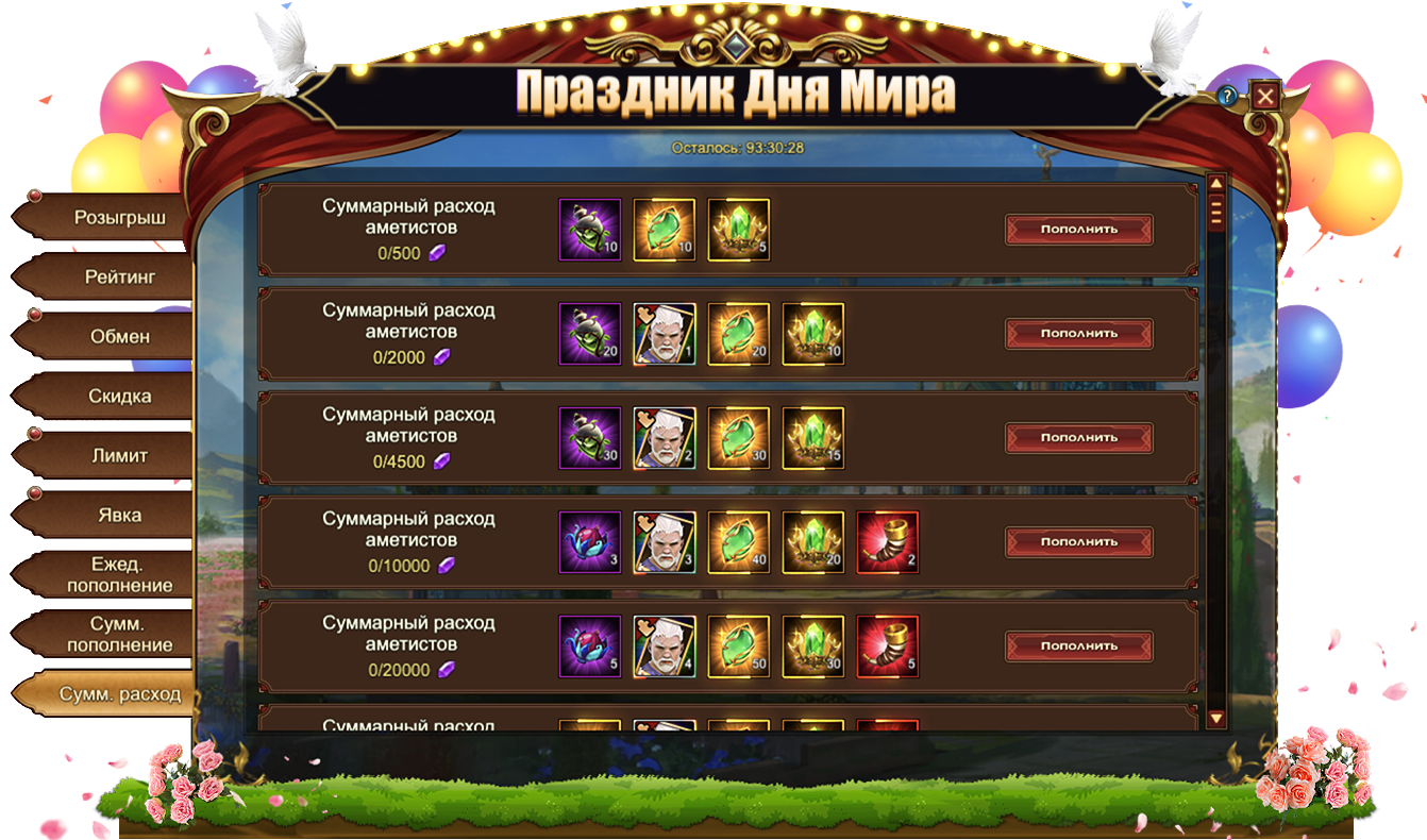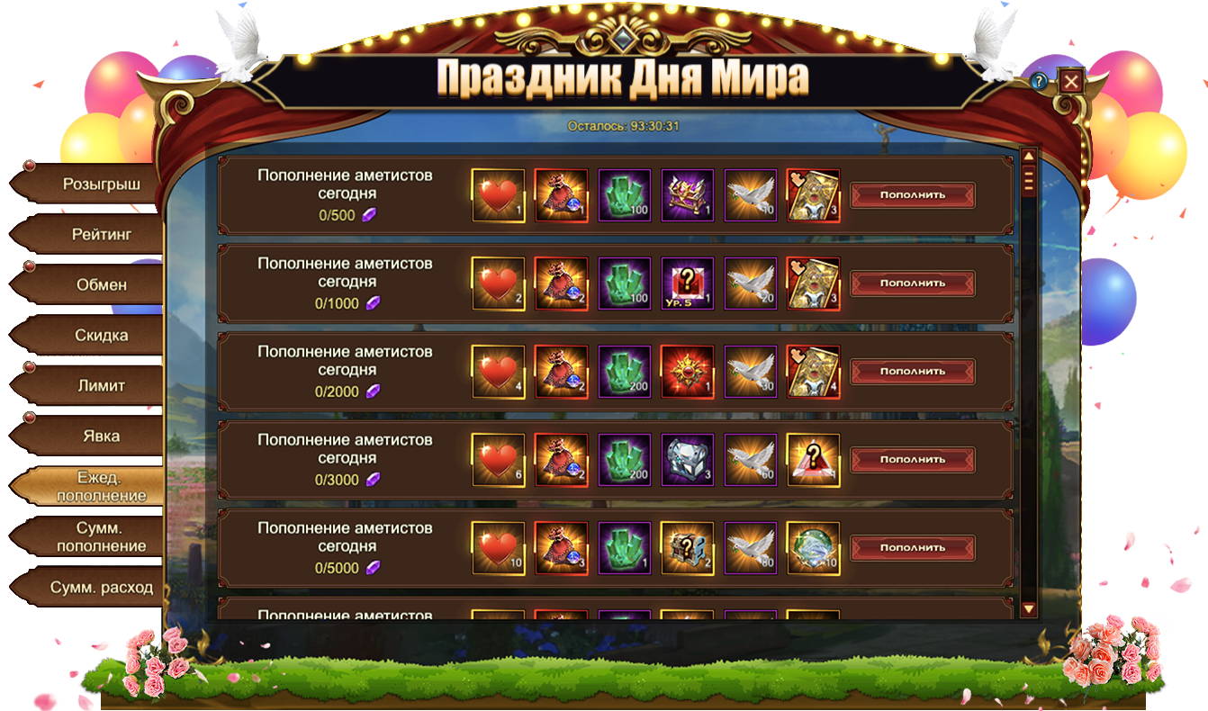 За пополнение счета на определенное количество аметистов за один день, вы можете получить: Изумруд, Сундук кристаллов 5 ур., Сундук самоцветов 6 ур., Сундук камней элементаля 4 ур., Голубь мираЖетон дня мира, Сундук книг навыковСундук кристаллов 7 ур., Дух крыльев святости, Сундук кристаллов 9 ур., Оранжевое созвездие, Сундук снаряжения героя (оранж.), Сущность артефактаСундук редкостей, Письмо с молитвой, Фрагмент паровой стрекозы, Эмблема величия, [Фрагмент карты] Тюр.